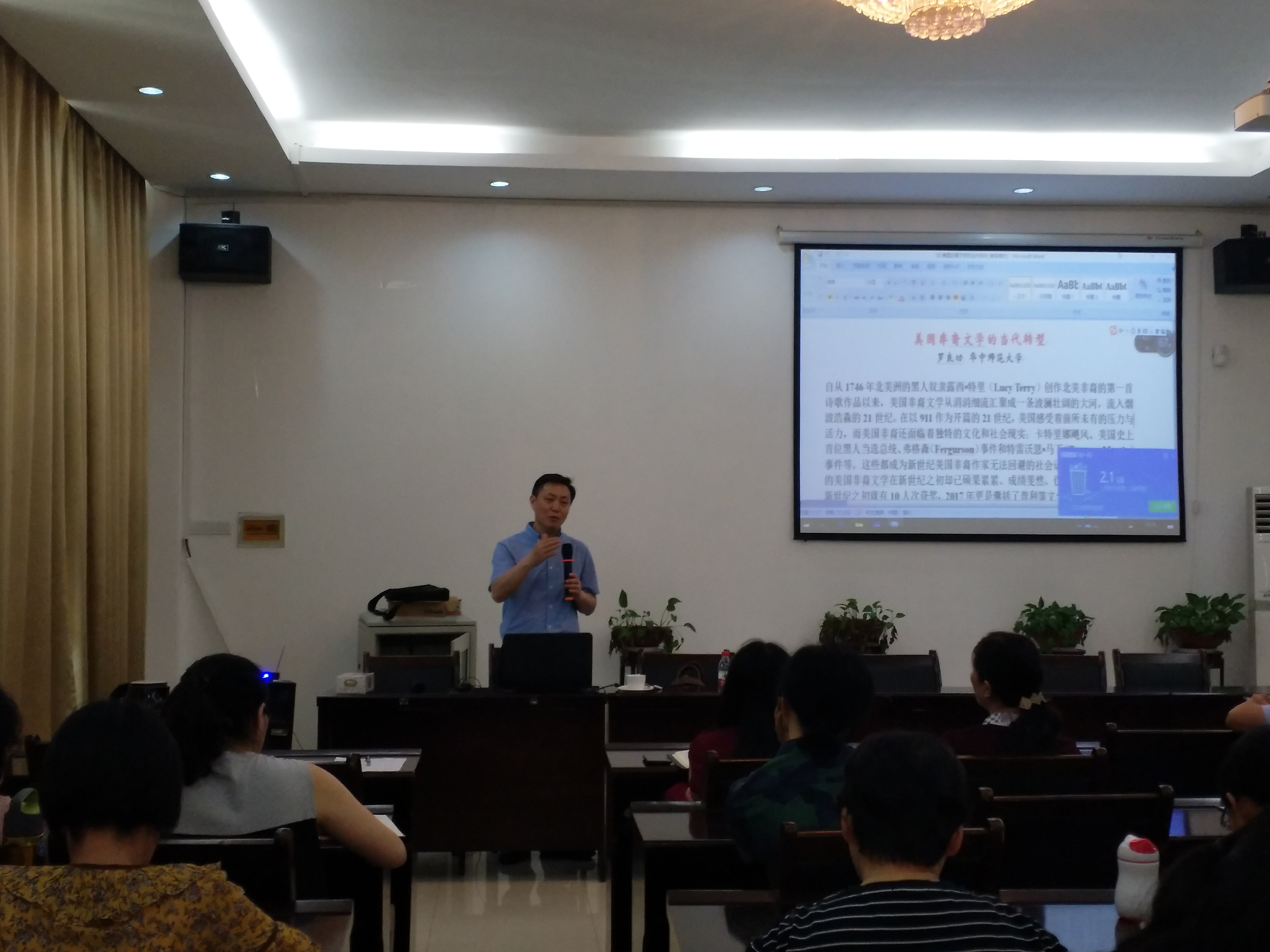 , 做主题为“美国非裔文学的当代转型”的讲座,讲座由副院长袁平华教授主持,放肆文学