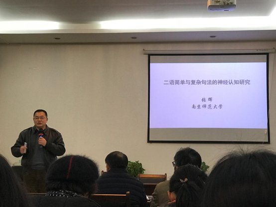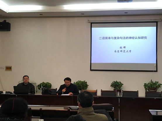 张辉教授为南京师范大学特聘教授,博士生导师。中国认知语言学研究会副会长兼秘书长,中国心理语言学研究会副会长,江苏省外国语言学学会副会长,主要从事认知语言学、神经语言学、二语习得的研究。在整场报告中,张辉教授用深入浅出的语言、幽默风趣的方式,介绍了事件相关电位的基本知识与母语加工中所涉及的与语言相关的事件相关电位的指标,并且讨论了二语简单句法与复杂句法的研究。他指出,母语者与二语学习者在复杂句法的填充语——空位依存的加工上存在非常明显的差异。母语者主要依靠句法结构知识而不受语义违反或语义不合理性的影响,但二语学习者,即使是高水平的,则更倾向于使用语义信息加工这种复杂句法现象而不使用句法知识。