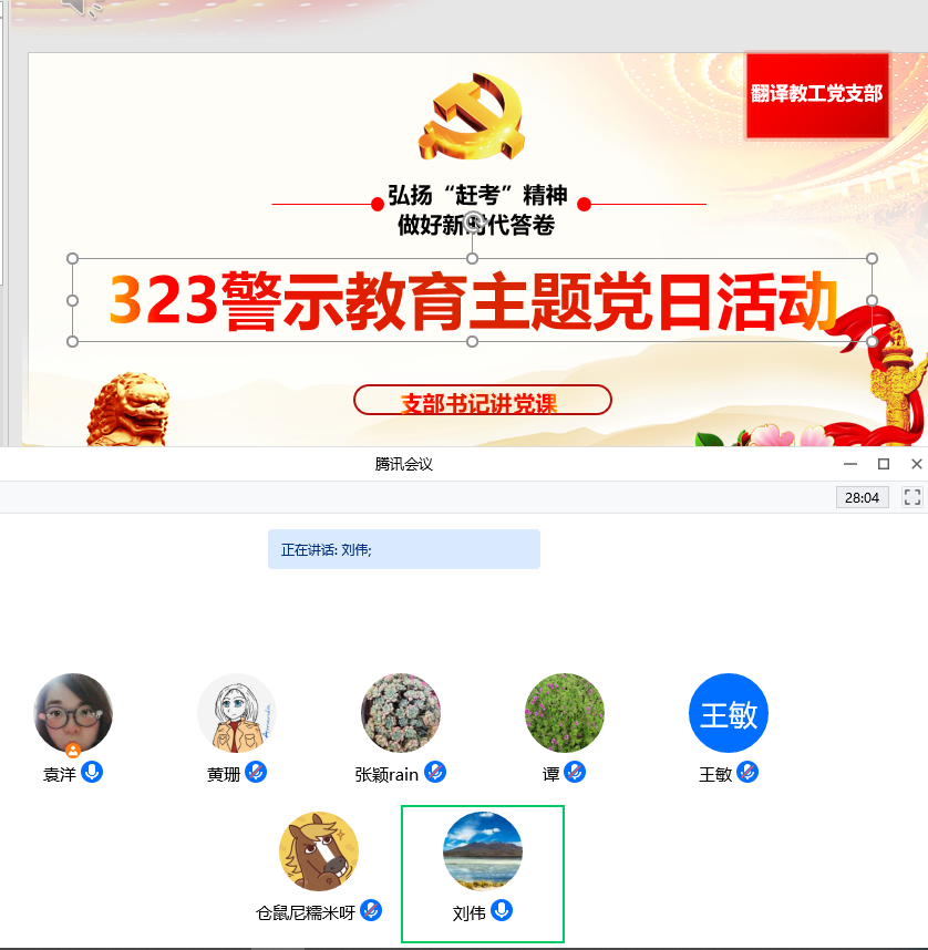 翻译教工党支部于腾讯会议召开“3·23警示教育”主题党日活动,同时支部书记袁洋同志讲微党课《弘扬“赶考”精神 做好新时代答卷》。学院党委副书记刘朝武同志出席会议并发表讲话。