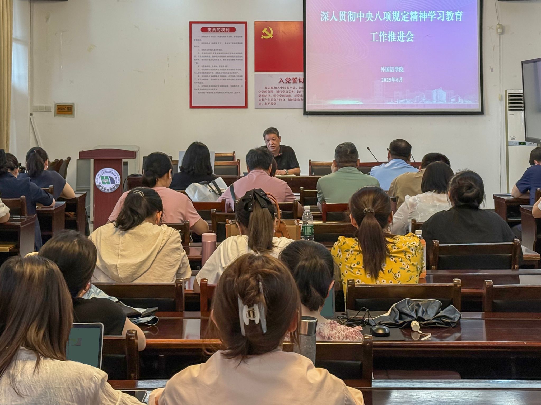 召开深入贯彻中央八项规定精神学习教育工作推进会暨专题党课,传达学习习近平总书记重要讲话和重要指示批示精神,阶段性总结学习教育推进情况,安排下一阶段重点任务,推动全院学习教育走深走实。学院党委书记薛先庆主持会议并以“中央八项规定精神的核心和实质”为题讲授专题党课,全体教工党员参加会议。