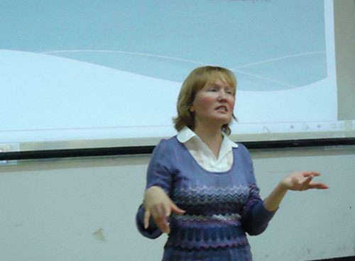 讲座现场观众们听得津津有味 本次主讲分别为外教Patty和Olga。Patty就“Body”这一主题为同学们发表了精彩演说,而Olga就“Relax——don’t worry,be happy”也发表了独特的见解。讲座吸引了大一、大二的广大英语爱好者。下午2点不到,讲座现场已是爆满。Patty以唱、听结合的方式引入主题。然后通过相关视频向大家展示了关于主题“body”的名词、动词概念,她还结合她妙趣横生的肢体语言向同学们细致地介绍了怎样用英语表示人体各部结构及人体各种动作。演讲期间,学生们积极参与相关互动,与Patty一起做各种用英语表达的肢体动作,并仔细聆听她的演讲。