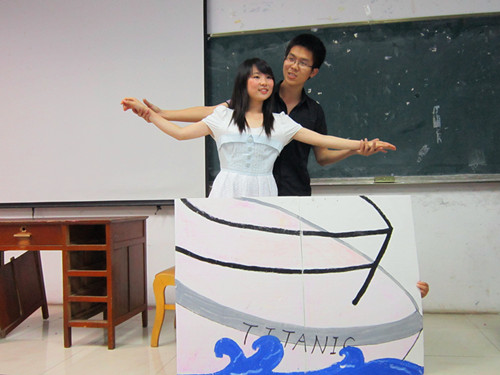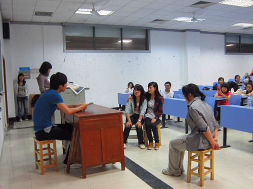 肖家玮潘政报道)5月5日晚上7点,一年一度的放肆文学 的英语剧大赛初赛在北区15栋118和116同时上演,来自外语学院10、11级共12个参赛班级在初赛中展现了各自的创作才华和表演才能,(大话西游)》笑料百出,high级英语4(不管明天变成如何)》表现了世界末日来临之际人性的觉醒,启迪我们要珍视眼前所有。