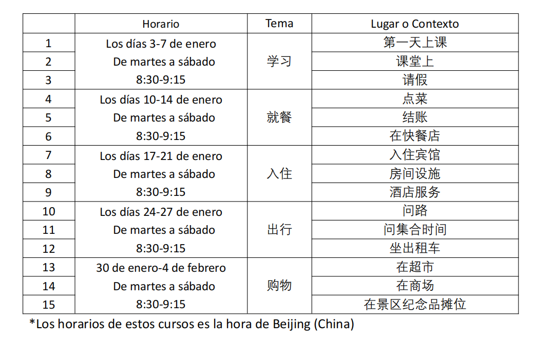 *Los horarios de estos cursos es la hora de Beijing (China)