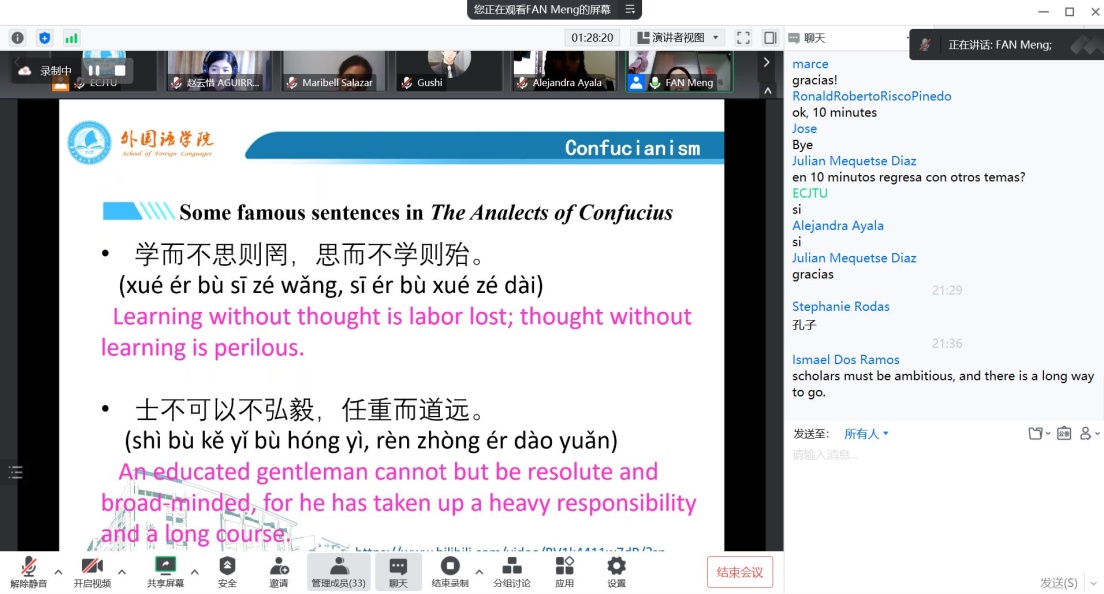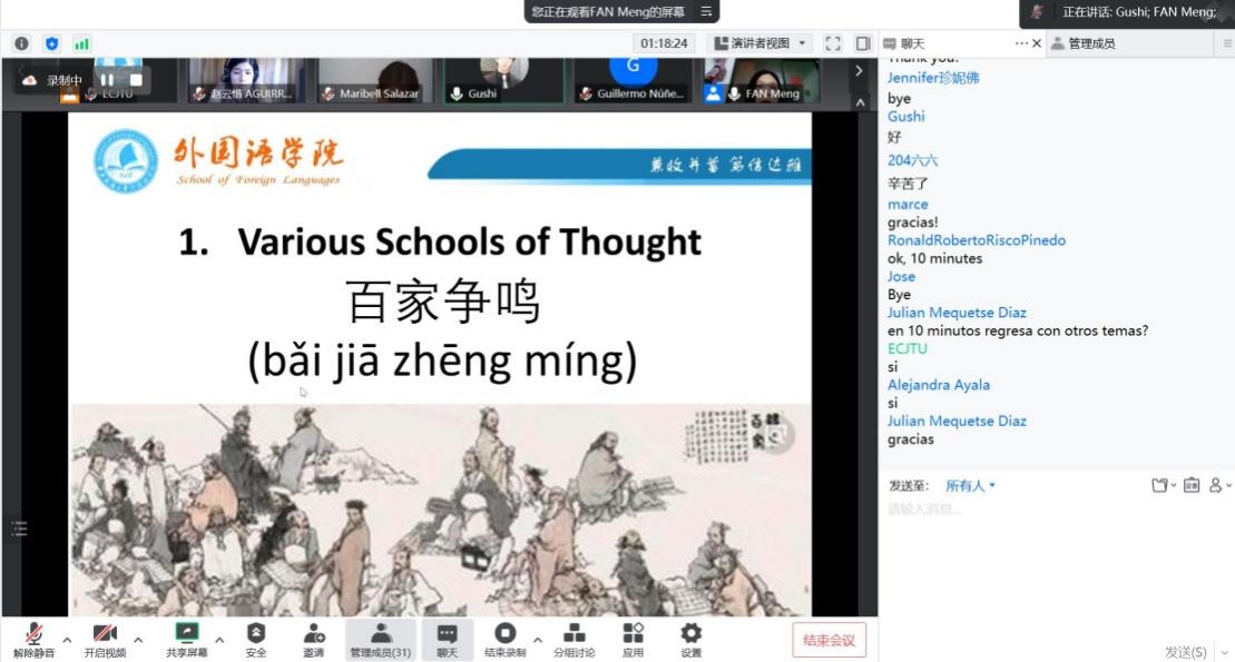樊梦老师从百家争鸣出发,讲解了各个朝代的哲学观点。樊梦老师生动的讲解使深奥的哲学思想变得通俗易懂。哲学源于生活,启发着各位学员思考生活。中国古代哲学思想这一文化符号对我国人民的生活及思维方式都有着极为深刻的影响,在一代代的传承中也早已深入中华儿女的骨髓之中,表现在中国人民的一言一行当中。樊梦老师对中国古代哲学思想的剖析使得一个个中华儿女生动立体了起来,也使得美洲学生们明白了我们骨子里的信仰、行为的源头。