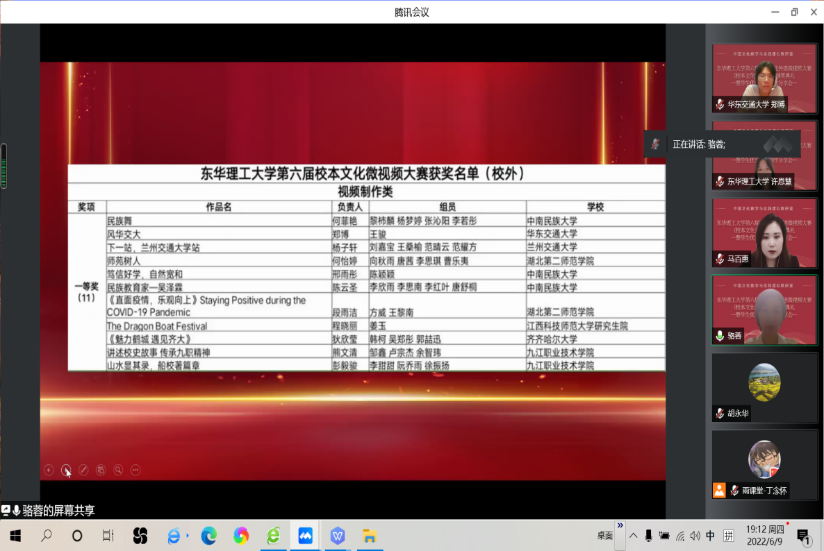 2022年6月9日晚,东华理工大学第六届“中国文化外语微视频大赛”(校本文化主题专赛)开展“云颁奖”学生作品创作分享会。