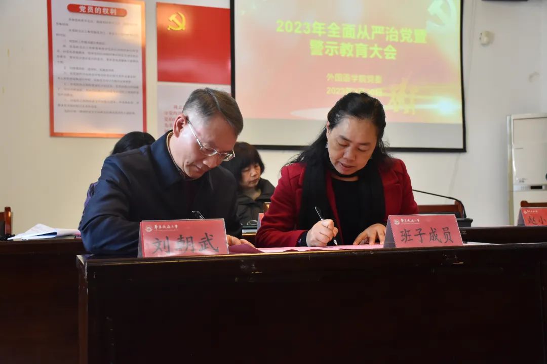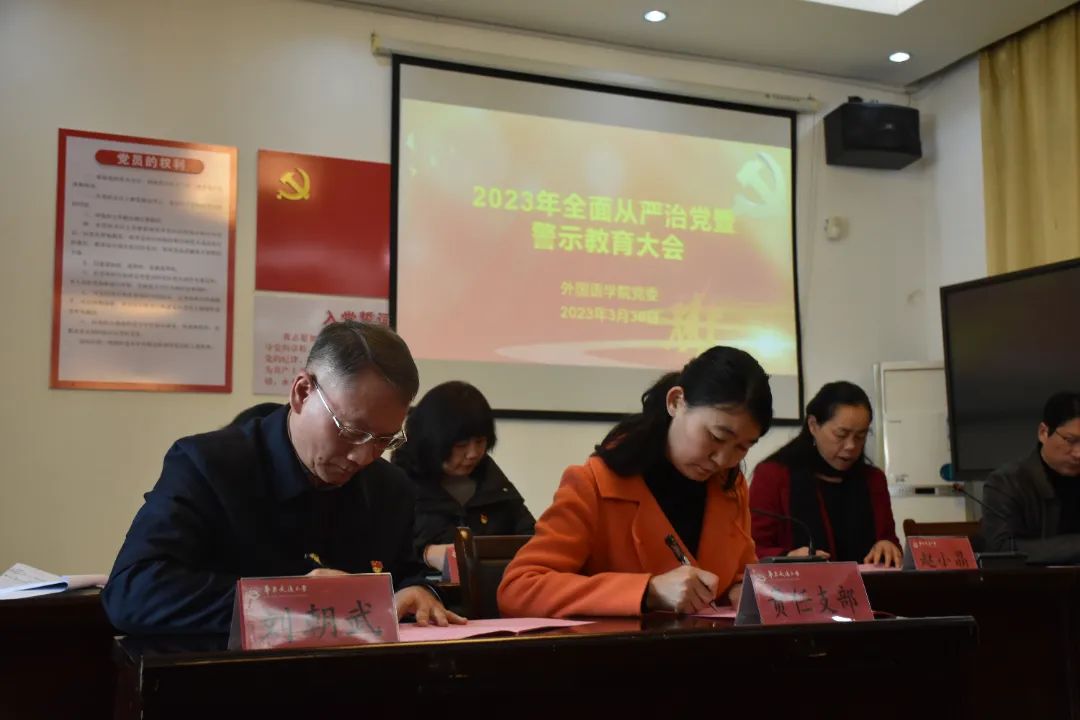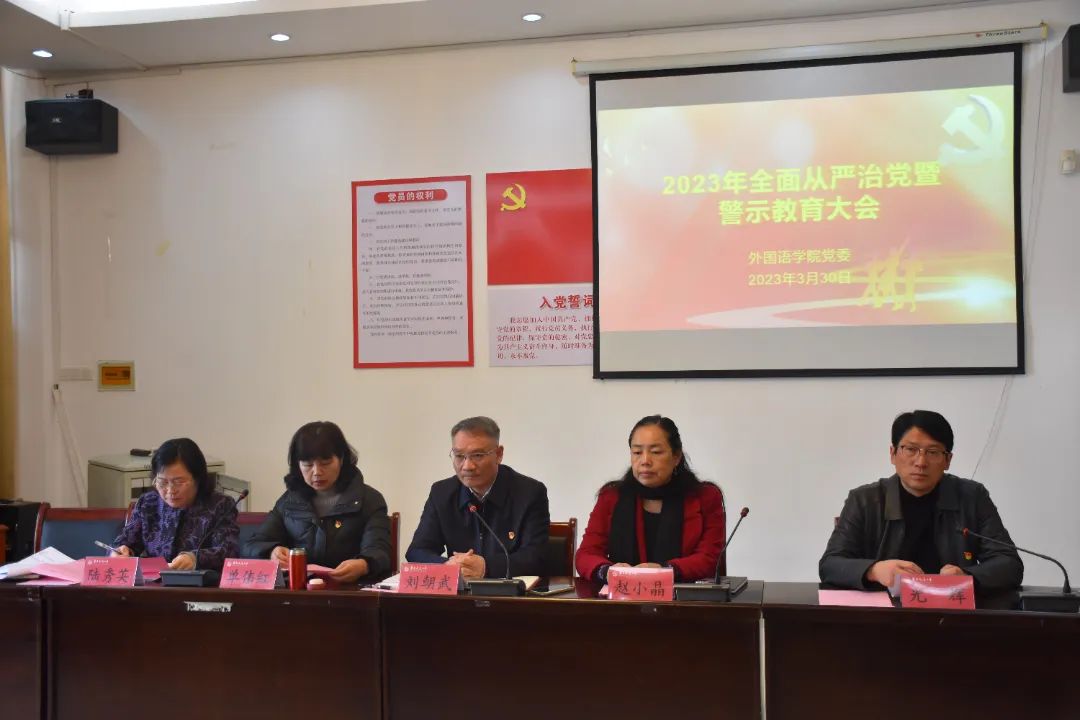 为落实校党委书记柳和生在学校召开的2023年全面从严治党和警示教育大会上的讲话要求,推动全面从严治党向纵深发展,外语学院党委3月30日于博雅楼102会议室召开2023年全面从严治党暨警示教育大会。本次会议由外语学院党委副书记光辉主持,全体院领导出席会议,外语学院全体教职工参会。