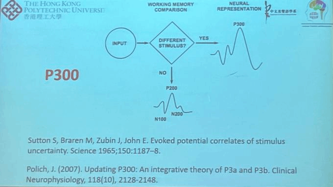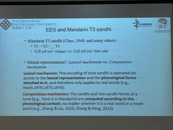 第二场讲座题为《脑电波与语言加工》。彭刚教授首先向我们展示了几个典型的ERP成分,如P300,MMN,N400,P600等,并向我们分析了这些脑电成分与语言加工的联系。随后,彭刚教授介绍了依赖于语境的语音感知的时间进程和普通话上上变调的时间进程,以此来向我们展示目前脑电波与语言加工的一些最新研究趋势和成果。