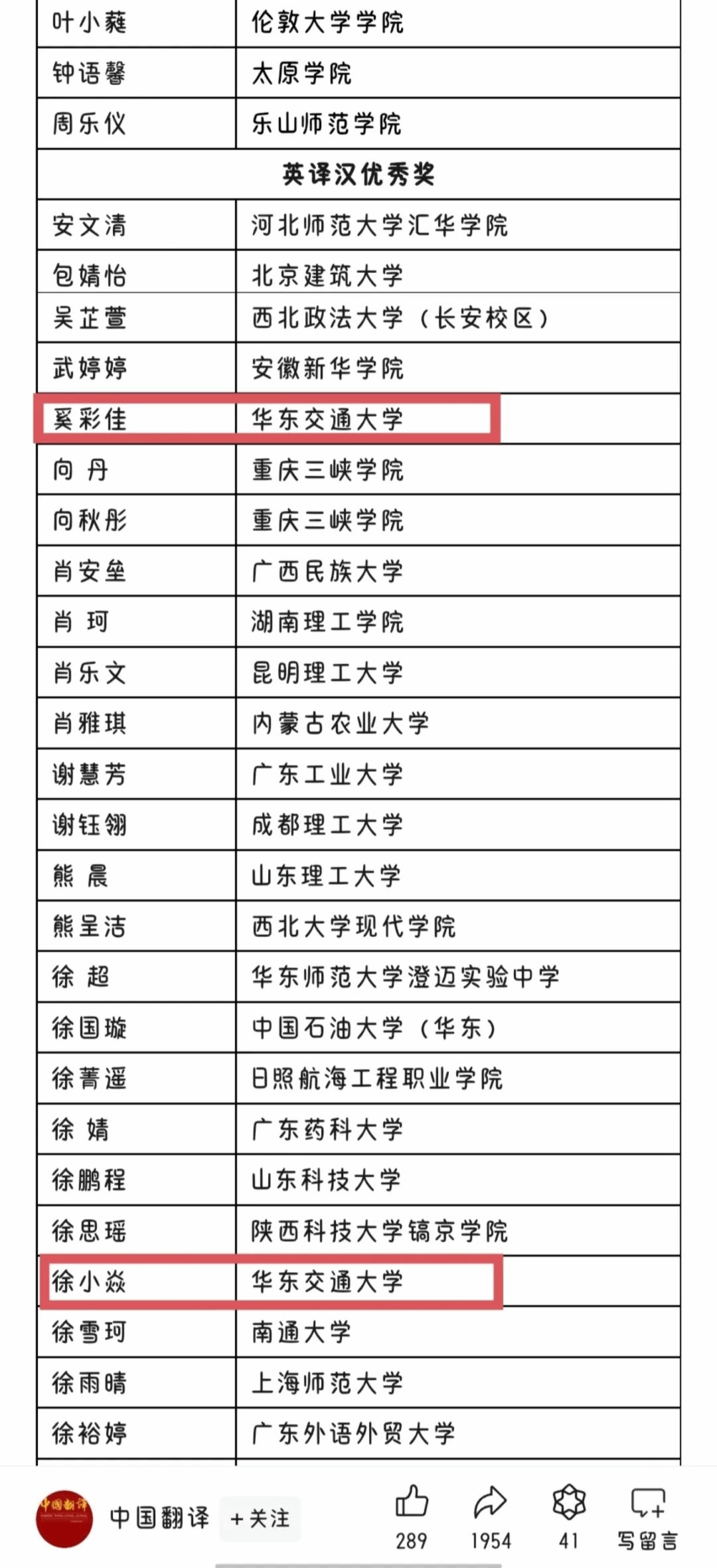 奚彩佳、徐小焱获英译汉优秀奖。